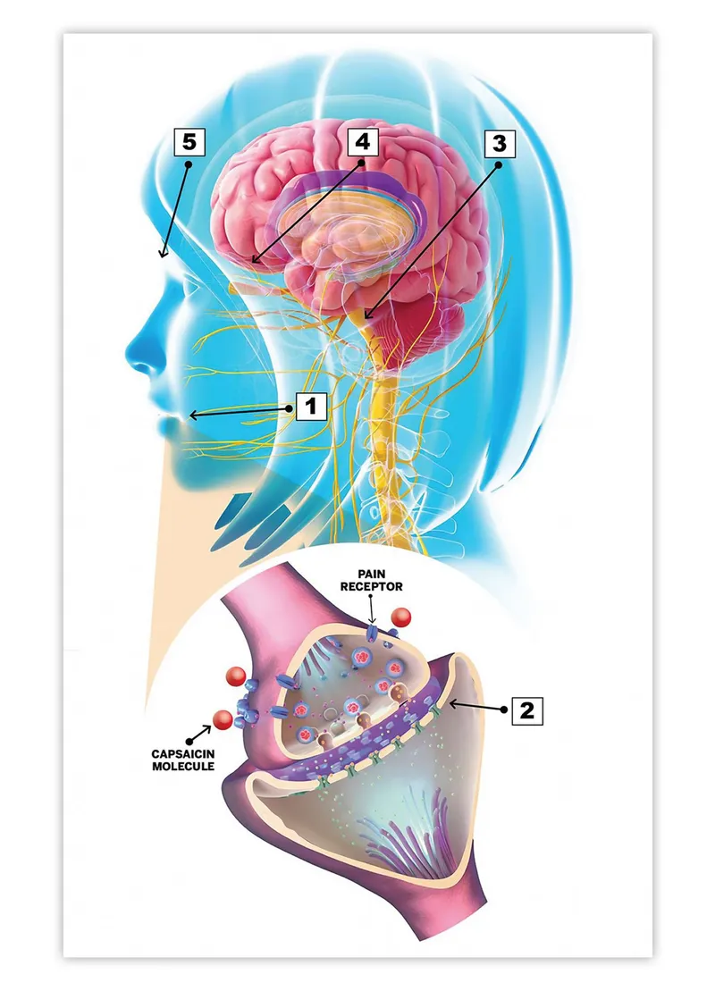 1. Sự báo động: Các phân tử capsaicin tiết ra từ ớt sẽ bám vào các thụ thể chuyên biệt trên lưỡi.