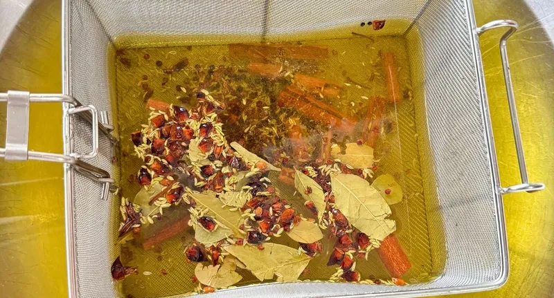Đầu tiên, các loại thảo mộc khô như quế, hồi, tiểu hồi, xuyên tiêu, tiêu đen và lá nguyệt quế được thả vào dầu ở nhiệt độ thấp. Từng phút trôi qua, hương thơm ấm dần, len lỏi vào không khí – đó là mùi của ẩm thực Việt xưa, của những gian bếp củi, của nồi cá kho đang sôi liu riu.
