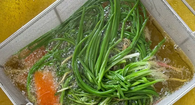 Khi tinh dầu từ thảo mộc đã dậy mùi, lớp rau củ tươi gồm hành tím, hành lá, tỏi, cà rốt, ngò, gừng mới được cho vào – tạo nên một lớp hương thứ hai: thơm đậm đà, hoà quyện nồng nàn tự nhiên .