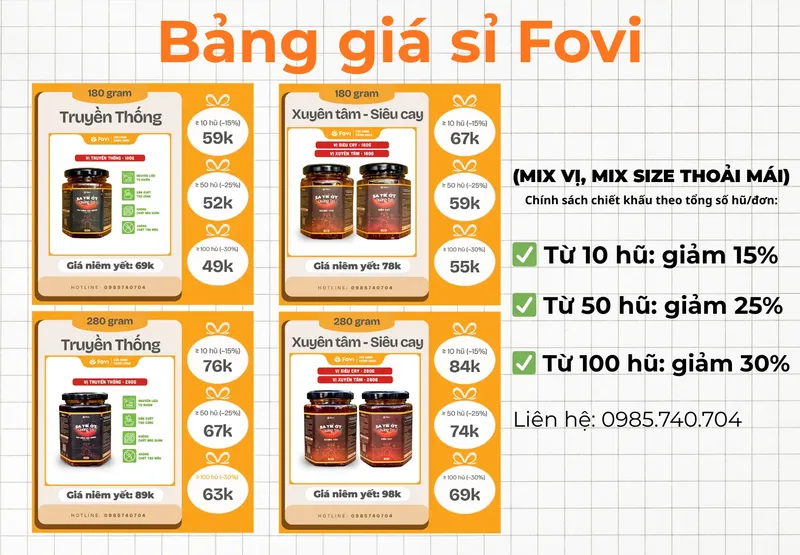 Fovi áp dụng chiết khấu theo tổng số hũ trong 1 đơn. Khách có thể mix 3 vị (Truyền Thống – Xuyên Tâm – Siêu Cay) và mix 2 size (180g – 280g) để đạt mốc chiết khấu.